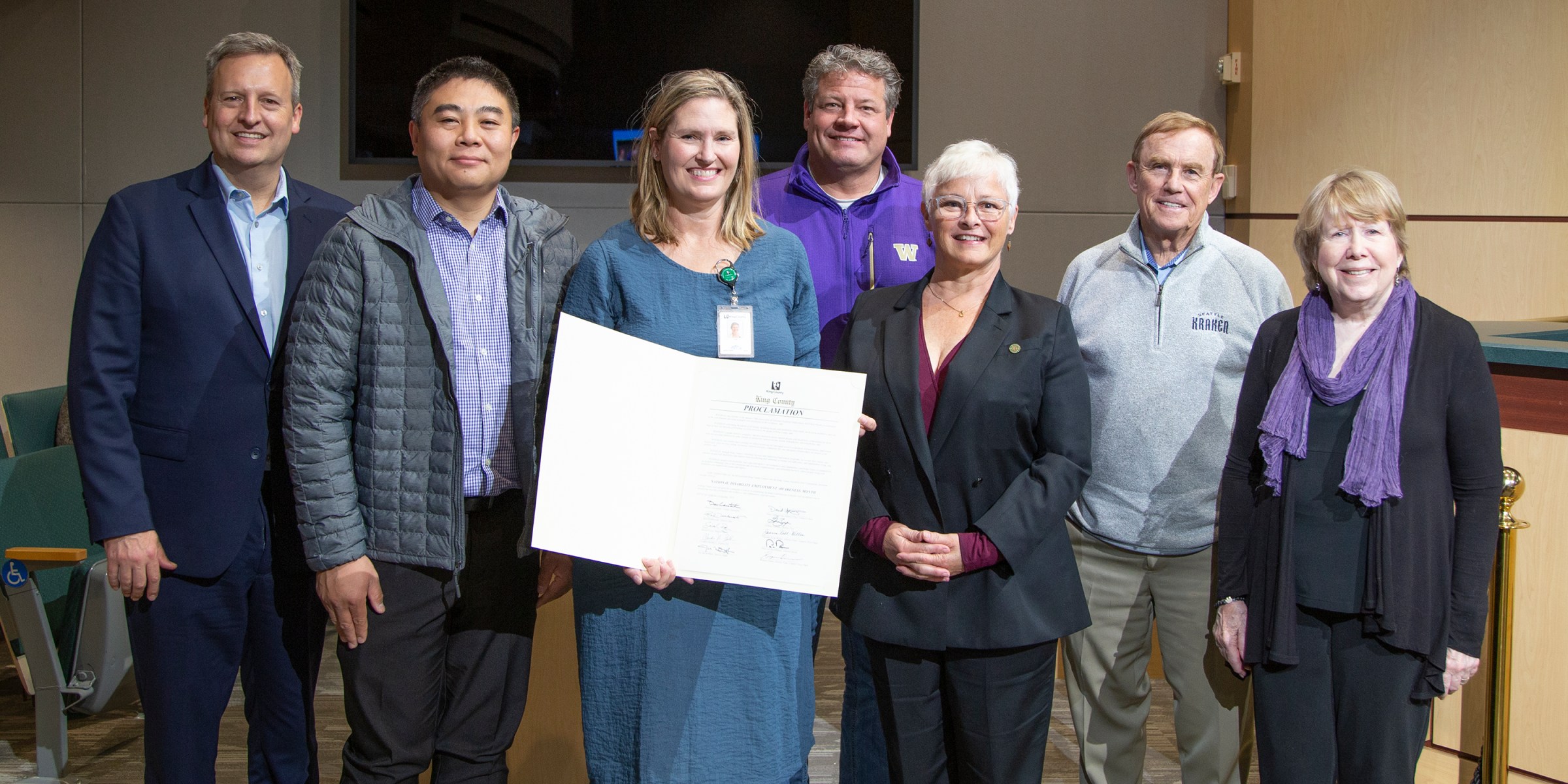 Pictured: From left to right, King County Council Chair Dave Upthegrove, Central Employee Services Division (CESD) Deputy Director Peter Hu, CESD Disability Services Manager Erin McPhee, and Councilmembers Reagan Dunn, Sarah Perry, Peter von Reichbauer, and Jeanne Kohl-Welles.
