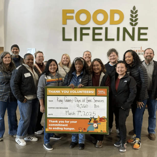 Thirteen employees from the Department of Executive Services (DES) Director’s Office sorted and repackaged nearly 4,300 pounds of baked goods at Food Lifeline recently. That’s a lot of dough! The Director’s Office has volunteered at Food Lifeline for four consecutive years as a team-building activity and to give back to the community.