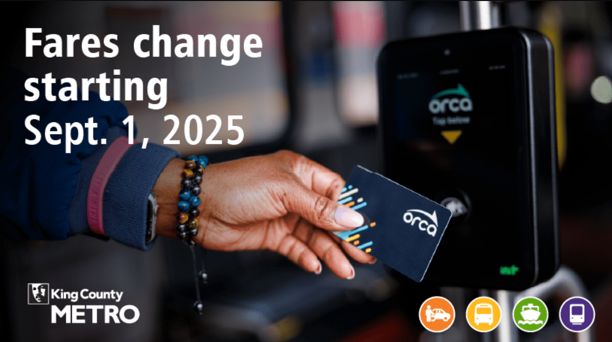 Adult fares are changing Sept. 1, 2025, on King County Metro buses, Metro Flex, both Seattle Streetcar lines and both King County Water Taxi routes. ORCA LIFT fares on both Water Taxi routes are also changing. Reduced fare rates for Senior, Disabled, Youth, and ORCA LIFT riders will remain unchanged everywhere else.
