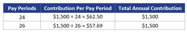 Example: Your annual salary is $50,000; you contribute $50 per pay period.