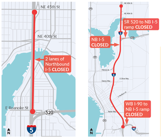 * Full northbound I-5 closures extend from I-90 to Northeast 45th Street