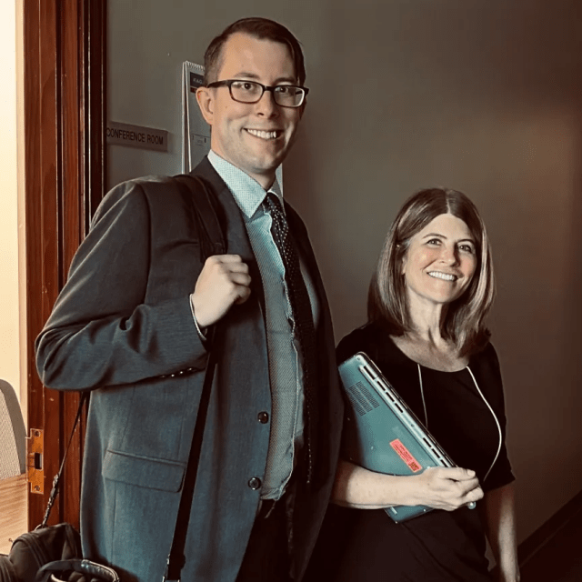 Pictured: Deb Wilson, right, and co-counsel Kell Brauer, left, preparing for their client’s trial.