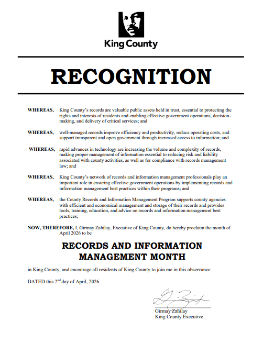 King County Executive Girmay Zahilay has proclaimed April as Records and Information Management Month. This month-long observance promotes record keeping best practices, provides awareness of the records management profession, and highlights the benefits of proper records and information management on our daily operations.