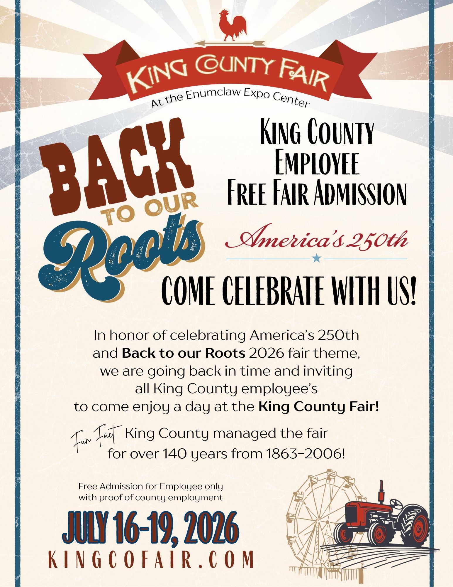 In honor of celebrating America’s 250th anniversary and the Back to our Roots 2026 fair theme, the fair is inviting all King County employees to enjoy a free day. King County managed the fair for over 140 years, from 1863-2006.