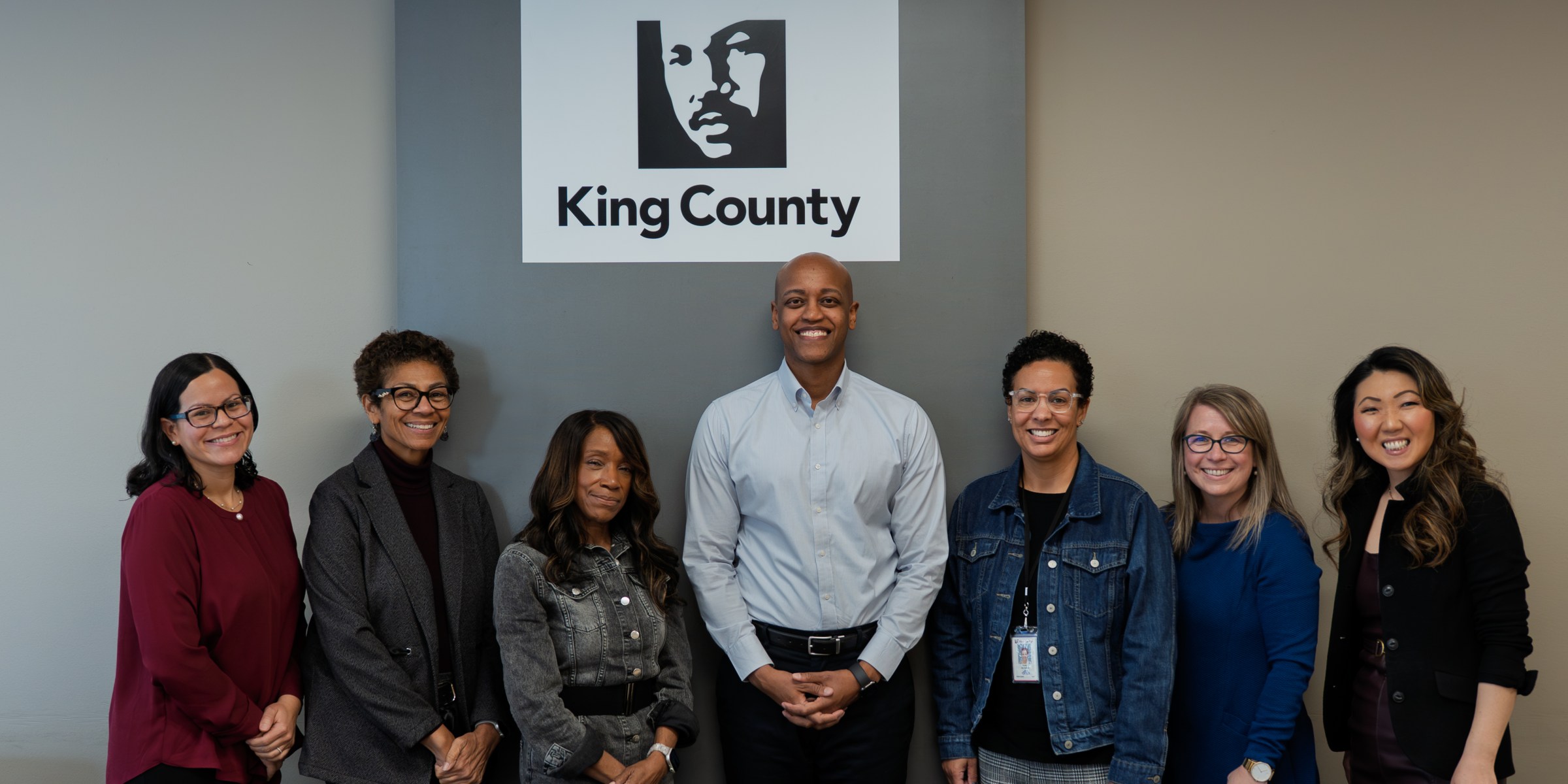 Pictured: From left to right, Dr. Sandra Valenciano, Sheriff Patti Cole-Tindall, Director Lorraine Patterson-Harris, Executive Girmay Zahilay, Deputy Director Amber Green, General Manager Michelle Allison and Office of the Executive Chief Operating Officer Hyeok Kim. Due to scheduling conflicts, not pictured here are DCHS Director Susan McLaughlin and DHR Acting Director Megan Pedersen.