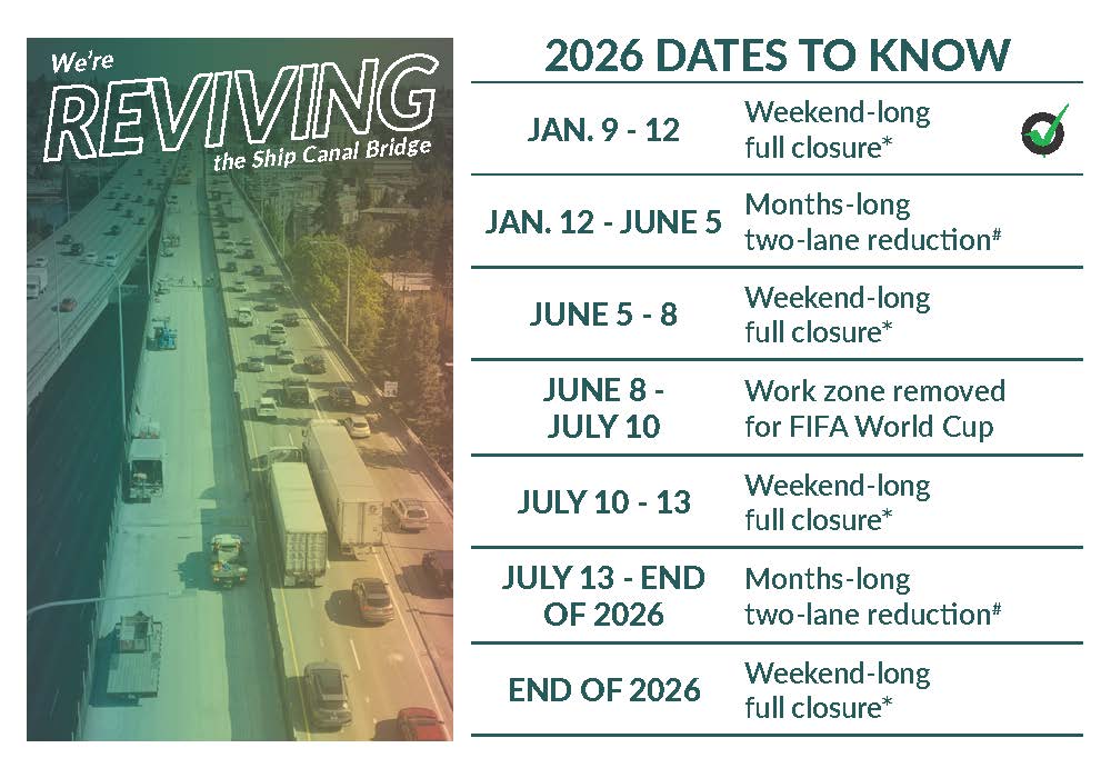 As part of the project, two northbound lanes across the Ship Canal Bridge will close while crews repair and resurface the bridge deck. To minimize impacts during major events, work zones will be removed in June for World Cup soccer matches in Seattle, then reinstalled when games conclude in July.