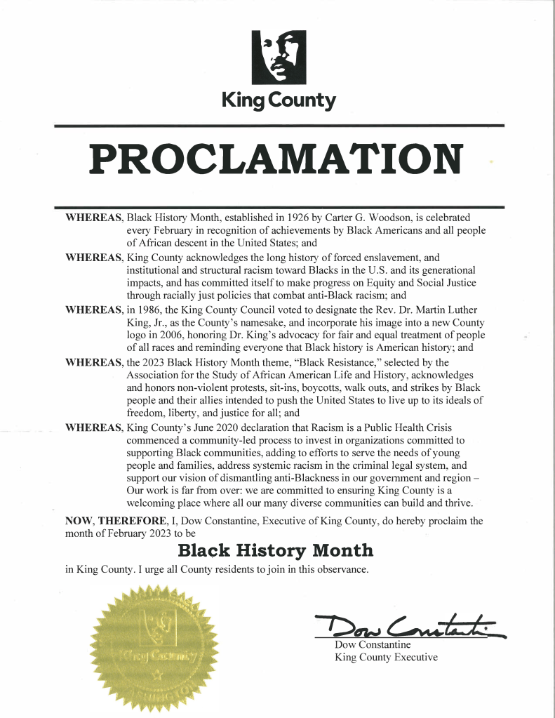 In light of these statements and others, Dow Constantine, King County Executive, proclaims February 2023 to be Black History Month in King County.