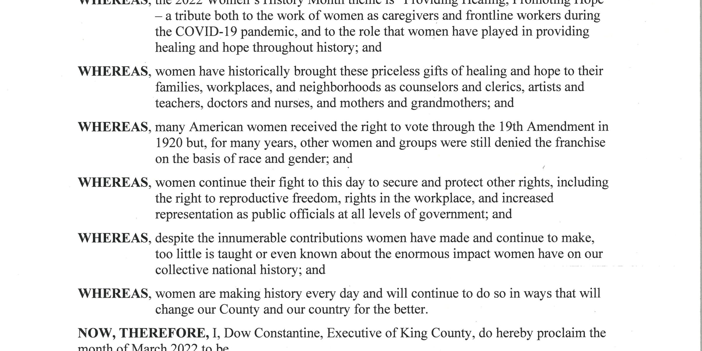 “The 2022 Women’s History Month theme is ‘Providing Healing, Promoting Hope” – a tribute both to the work of women as caregivers and frontline workers during the COVID-19 pandemic, and to the role that women have played in providing healing and hope throughout history,” Executive Constantine said in the Proclamation. “Despite the innumerable contributions women have made and continue to make, too little is taught or even known about the enormous impact women have on our collective national history.”