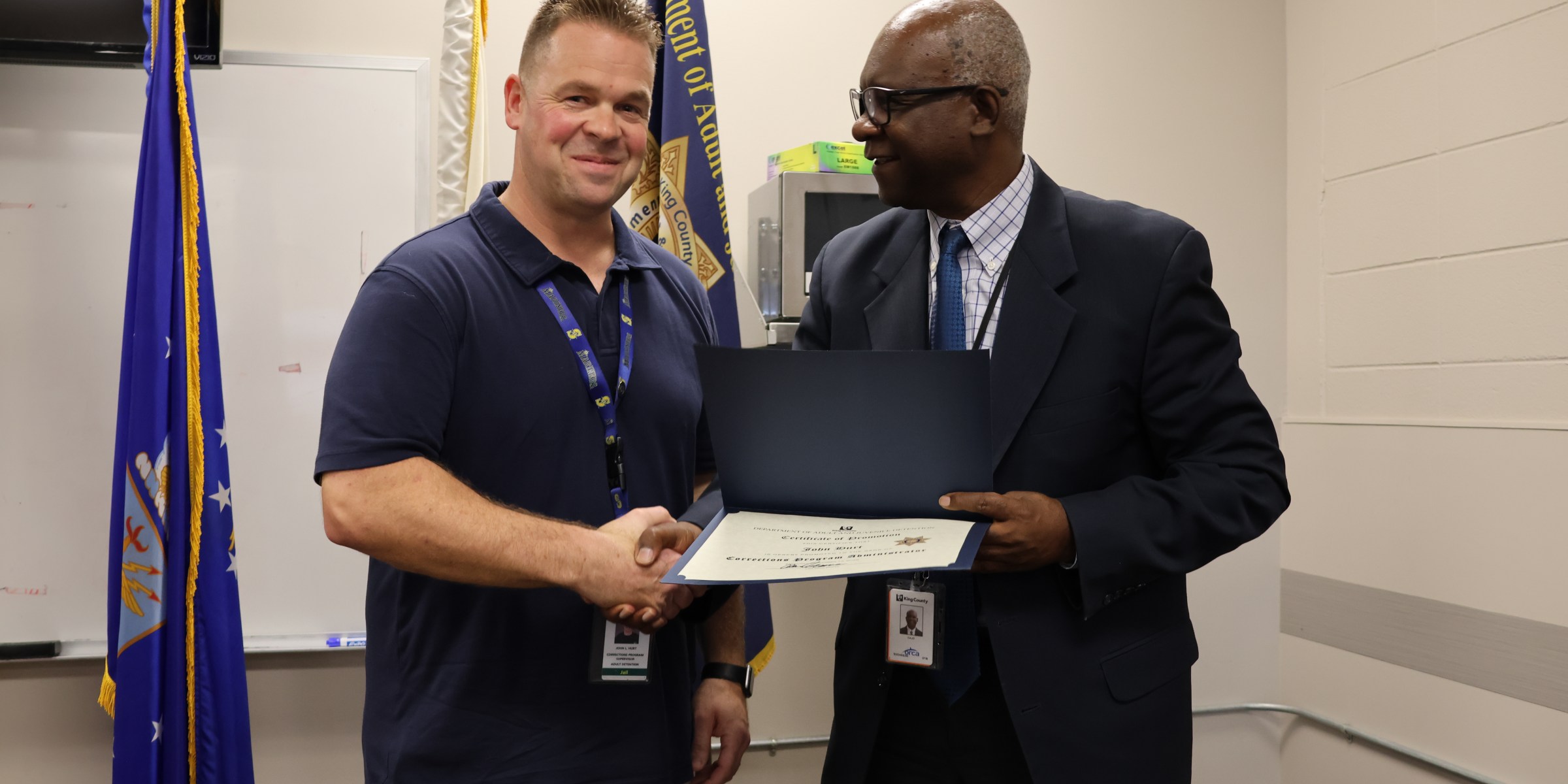 Pictured: Corrections Program Administrator John Hurt, left, is congratulated by Department of Adult and Juvenile Detention Director Allen Nance.