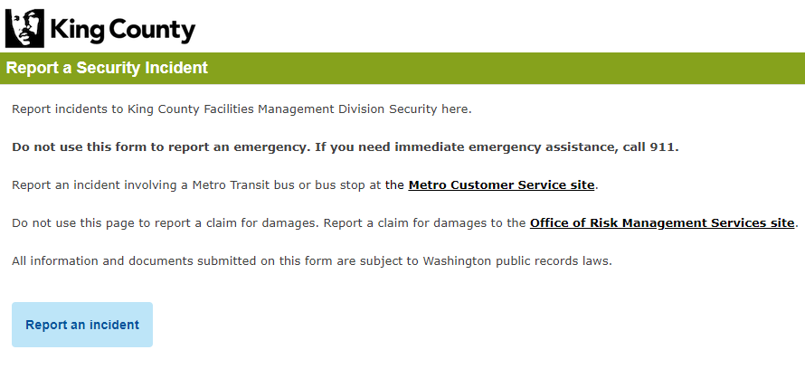 Every King County employee should feel safe and secure when at work. To achieve this, we remind you to report any threatening behavior or non-emergency incidents for follow-up to the FMD Security Unit using the online Security Incident Report form. You can report incidents that happen at work or on your commute. Also notify your supervisor, manager, and/or director as soon as you can.