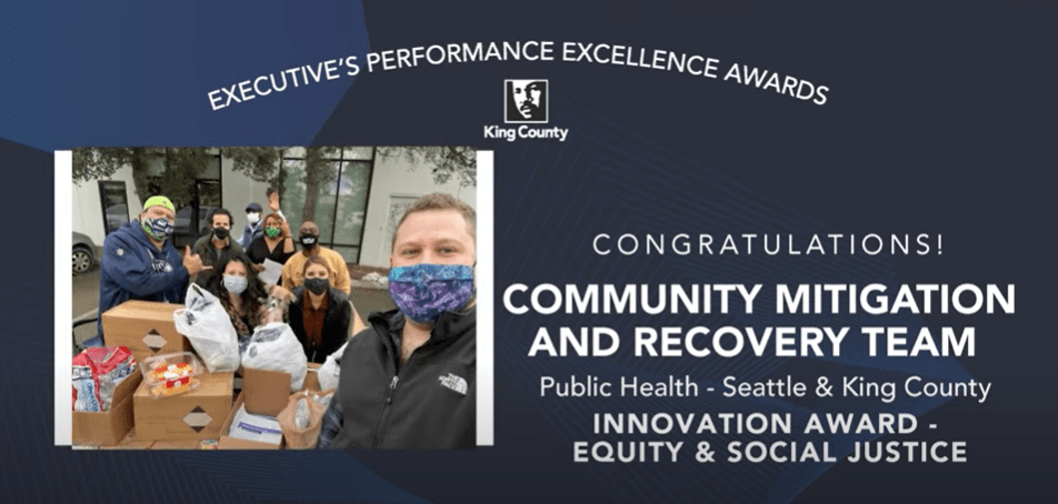 This year’s Equity and Social Justice Award recipient is the Department of Public Health – Seattle & King County’s Community Mitigation and Recovery Team (CMR). These honorees consider challenges within their delivery of services to King County residents, and developed solutions that address important needs. They met each challenge in a creative and forward-thinking manner that reflects our True North values.