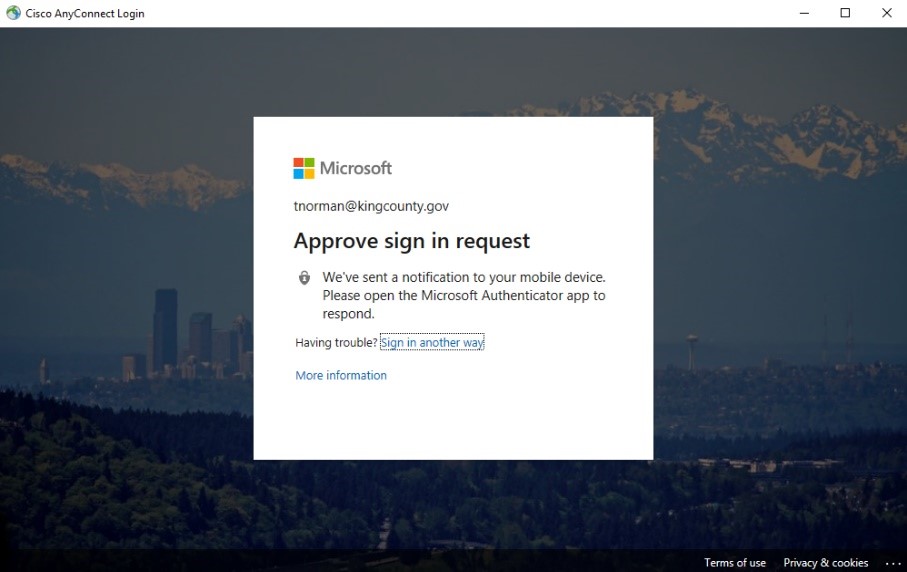 King County is enabling MFA (Multi-Factor Authentication) technology as an additional layer of cyber security to the VPN (King County is enabling MFA (Multi-Factor Authentication) technology as an additional layer of cyber security to the VPN (Virtual Private Network) solution, AnyConnect. At this time, employees are only required to input their username and password to login to AnyConnect. Soon, employees will also experience an MFA challenge on the same device or phone number they use for Microsoft Office 365. If you do not currently utilize MFA for enhanced cyber security, do not worry. KCIT is working with senior leadership to get every employee scheduled soon.