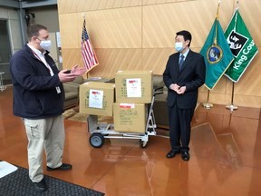 Pictured: Director General Alex Fan of the Taipei Economic and Cultural Office brought 10,500 surgical masks from the Taiwanese government to King County Emergency Management recently. The masks will be distributed to long-term care facilities, EMS and others on the front lines working against COVID-19.