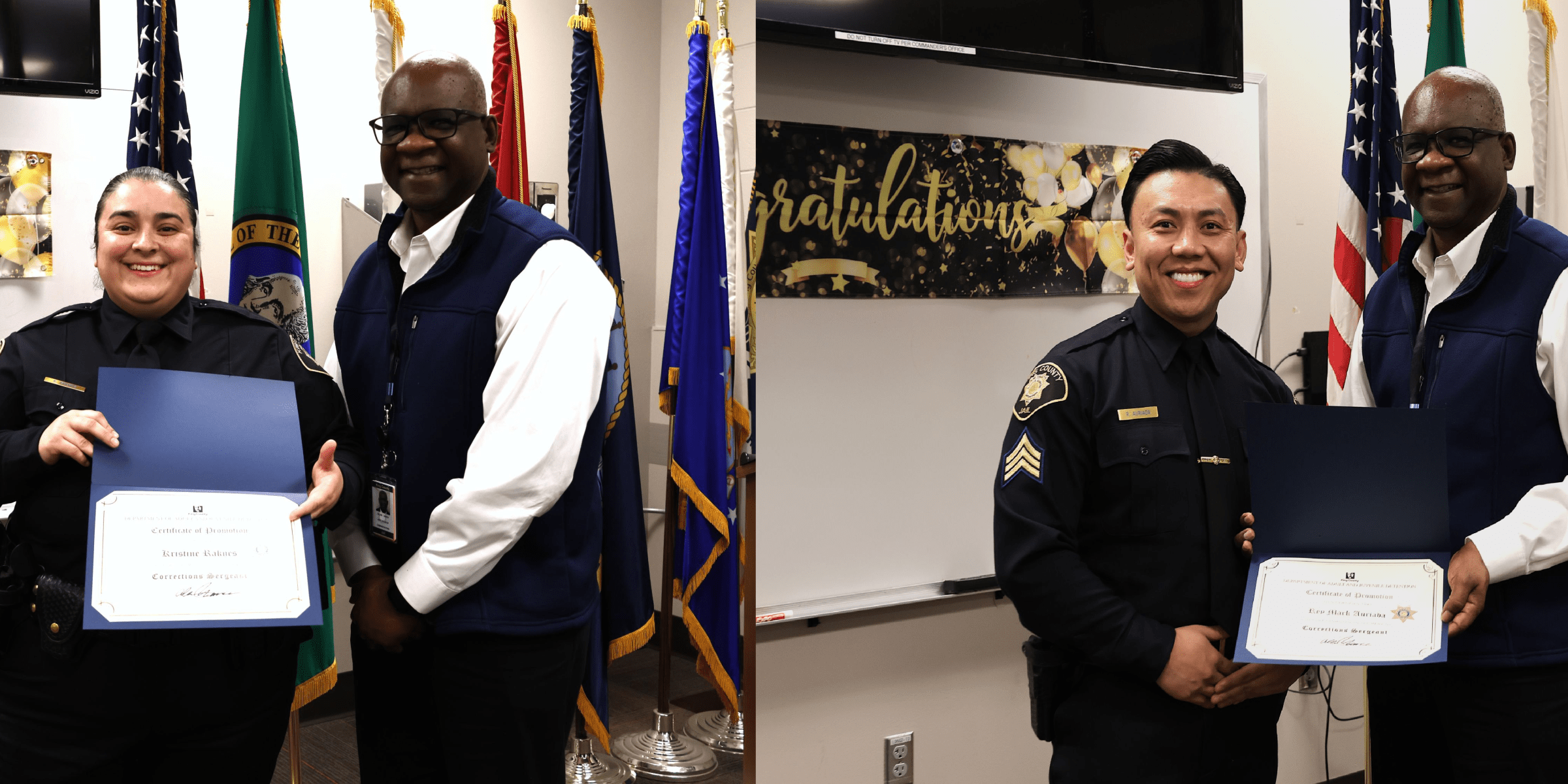 Colleagues, friends, and family members packed the Seattle Division Roll-call Room at the King County Correctional Facility (KCCF) to celebrate newly promoted Sergeants Kristine Raknes and Rey Auriada. Read more.