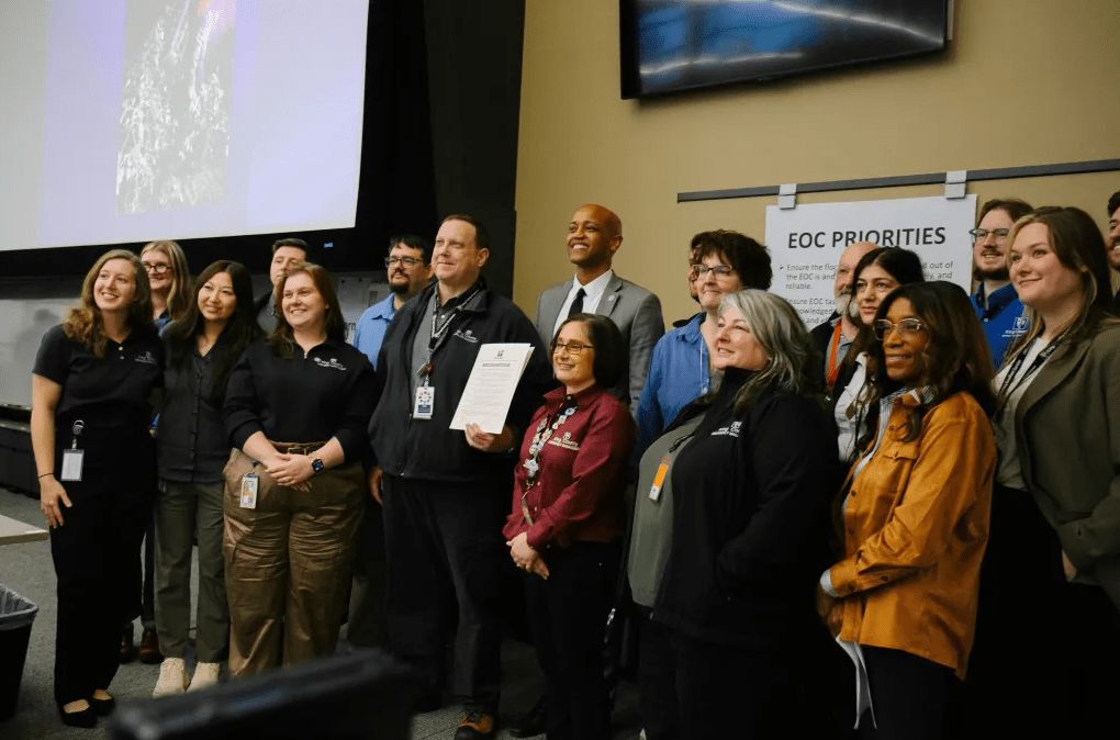 Pictured: Employees and leaders involved in the flood response and recovery gathered for a recognition event late last month. Brendan McCluskey, Director of Emergency Management, stands at center holding the proclamation.