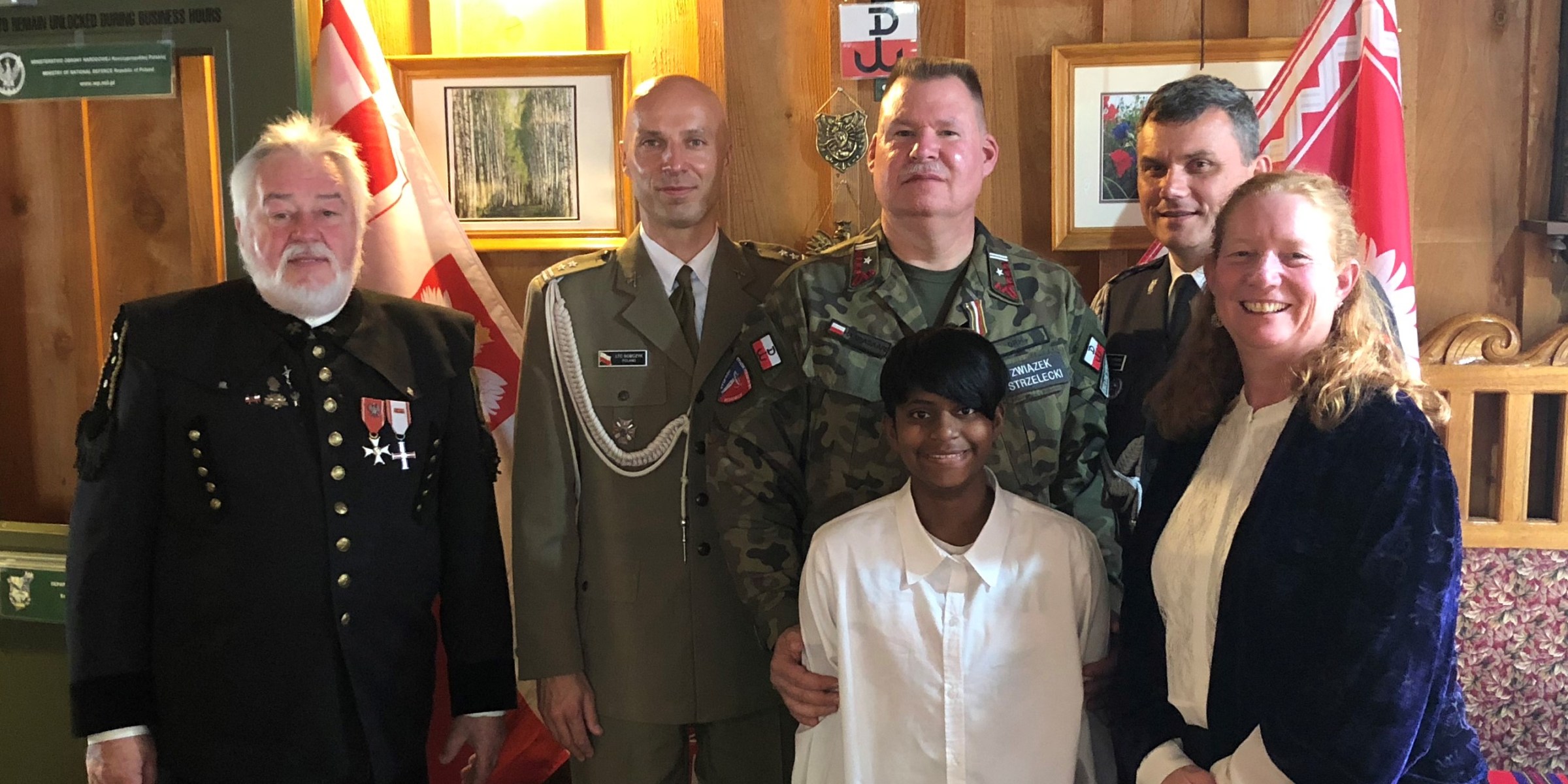 Pictured from left to right: Cross of Polonia Restituta recipient Mr. Andrzej Mroz, Assistant Defense Attaché at the Embassy of the Polish Republic Lieutenant Colonel Karol Sobczyk, Anthony Haapasaari, Shaan Haapasaari (Anthony and Kristin’s son), Defence Attaché at the Embassy of the Polish Republic Major General Cezary Wiśniewski, and Kristin Haapasaari (Anthony’s wife).