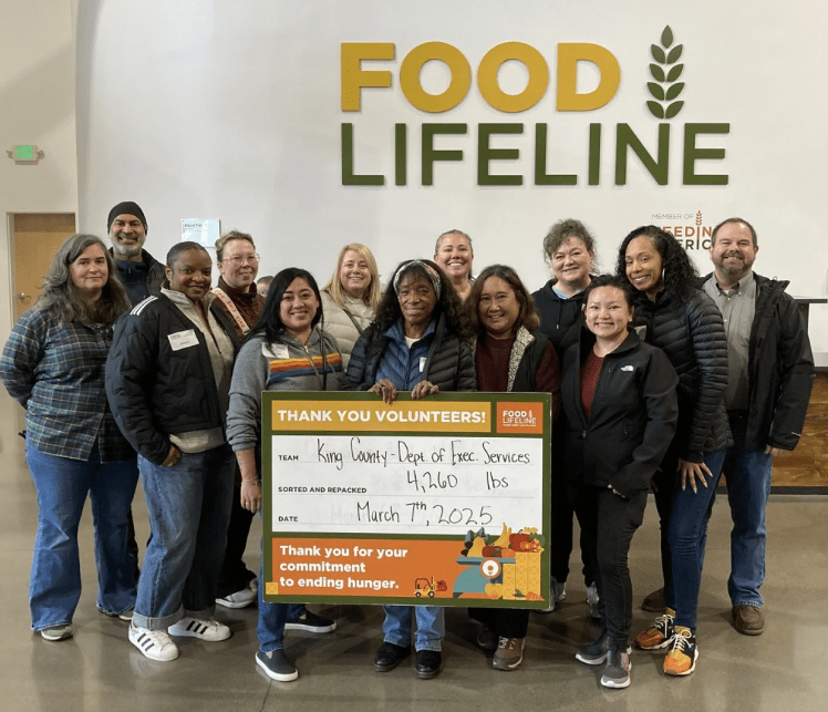 Thirteen employees from the Department of Executive Services (DES) Director’s Office sorted and repackaged nearly 4,300 pounds of baked goods at Food Lifeline recently. That’s a lot of dough! The Director’s Office has volunteered at Food Lifeline for four consecutive years as a team-building activity and to give back to the community.