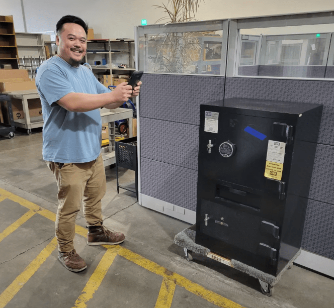 Pictured: Jimmy Bui, who works in Fleet’s warehouse, takes a photo of a large, black safe that will be added to the new online auction site.