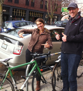 Beth Gunn, left, celebrates the return of her stolen bike with Matt Leber (photo courtesy of Seattle Bike Blog).