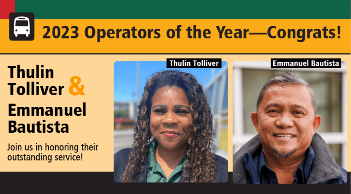 Emmanuel “Manny” Bautista and Thulin Tolliver were jointly honored as Metro’s 2023 Operators of the Year during a ceremony at the Central/Atlantic Base on Wednesday.