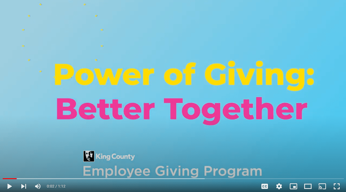 The Employee Giving Program helps King County employees support a multitude of causes from arts, culture, and humanities to mental health services, and more. We have been doing this for 35 years and it is amazing to see the positive impact King County employees can have by working – and giving – together. We can make a difference and are better together!