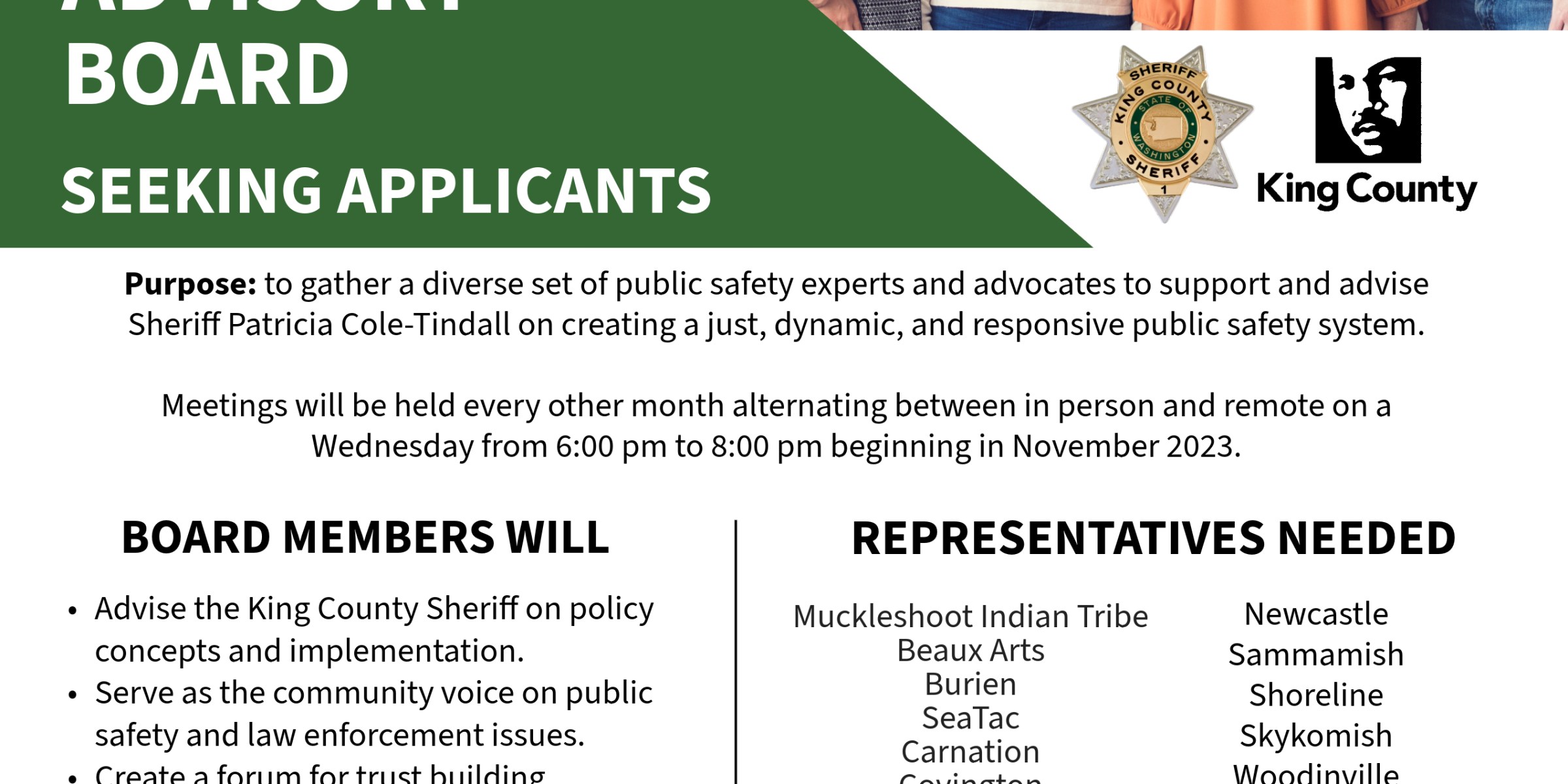 The King County Sheriff’s Office is seeking Community Advisory Board Members. The purpose of the Community Advisory Board is to gather a diverse set of public safety experts and advocates to support and advise Sheriff Patricia Cole-Tindall on creating a just, dynamic, and responsive public safety system. Board members will: