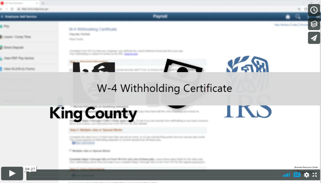 Form W-4 is used to let your employer know how much federal income tax to withhold from your pay. The IRS recommends completing a new Form W-4 when your personal or financial situation changes. This year, the IRS redesigned Form W-4 to reduce complexity and improve accuracy. Go to the IRS website for information about Tax Withholding, FAQs on the 2020 Form W-4, and a Tax Withholding Estimator. If you would like to adjust the amount withheld from your King County paycheck for tax purposes, please use PeopleSoft to update your W-4: Sign in to PeopleSoft…. Read More