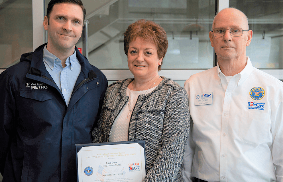 The Employer Support of the Guard and Reserve (ESGR) Patriot Award recognizes supervisor support for employee National Guard and Reserve members, highlighting the contributions, awareness, and care that enable their employees to both serve their country and their organization. Such support includes creating flexible schedules, providing time off before and after deployments, supporting families, and much more. The ESGR, an official Department of Defense program, has recently bestowed two Patriot Awards to King County supervisors: Jane Corcoran and Amanda Gudmunson from the Department of Executive Services Business Resource Center for their outstanding… Read More