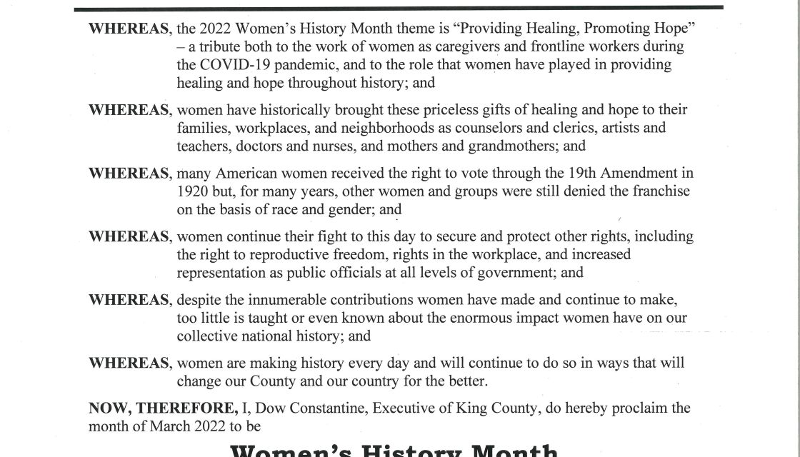 King County Executive Dow Constantine has proclaimed the month of March Women’s History Month in King County, and encouraged all residents to participate in events to commemorate and honor women and their contributions to our community and nation. “The 2022 Women’s History Month theme is ‘Providing Healing, Promoting Hope” – a tribute both to the work of women as caregivers and frontline workers during the COVID-19 pandemic, and to the role that women have played in providing healing and hope throughout history,” Executive Constantine said in the Proclamation. “Despite the innumerable contributions… Read More