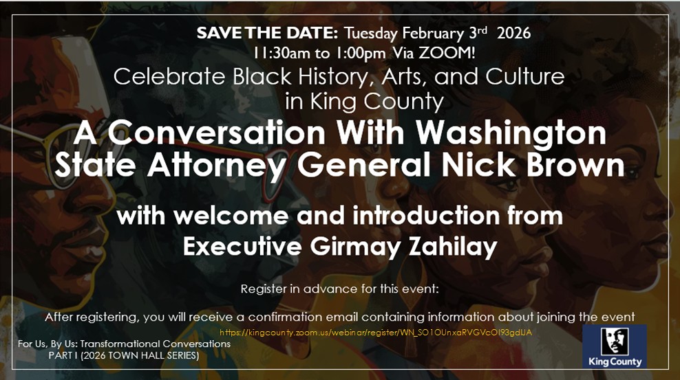 Employees are invited to join Washington State Attorney General Nick Brown and King County Executive Girmay Zahilay at an online event recognizing Black History Month on Tuesday, Feb. 3. Attorney General Brown will talk about key milestones in Black history for our region and discuss his own journey into public service. He will be welcomed and introduced by King County Executive Girmay Zahilay. Tuesday, Feb. 3, 11:30 a.m. to 1 p.m. on Zoom. Register here. This is a County-sponsored event and King County directors, managers, and supervisors are encouraged to permit employees to… Read More