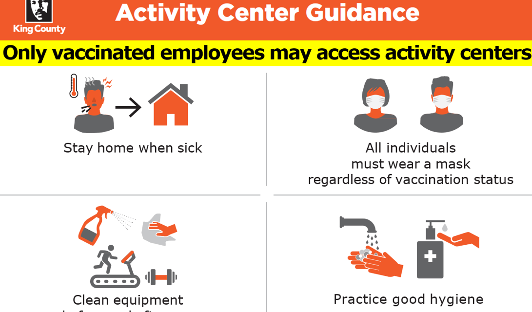 Verified proof of full vaccination is now required to use any of King County’s Activity Centers, and vaccinated staff must wear masks while in Activity Centers. Only those employees who have verified their proof of full vaccination through our existing process are permitted to enter Activity Centers. To provide proof of vaccination for verification, you have a couple of options: Initiating the COVID-19 Vaccination Declaration process through your NEOGOV Dashboard (click on Dashboard > Forms > COVID-19 Vaccination Declaration) and attaching a copy of an official document (see list below), OR Showing one of the following… Read More