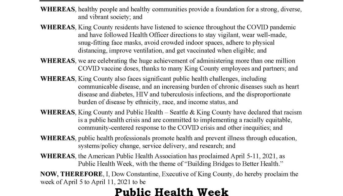 King County Executive Dow Constantine recorded a short video thanking Public Health – Seattle & King County employees for all of their work amid the COVID-19 pandemic in recognition of National Public Health Week, April 5-11, 2021. “I’d like to take a moment to thank all of our staff at Public Health – Seattle & King County for the incredible work you’ve been doing for the past 13 months and more as we confront this once in a century pandemic,” Executive Constantine said in the video. “You’ve saved thousands of lives. You’ve… Read More
