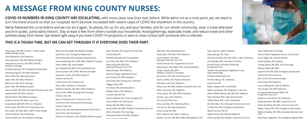 Crossposted from Public Health Insider In the midst of an unprecedented surge in COVID-19 cases, more than 500 King County nurses are issuing an urgent call to renew efforts to turn around this troubling trend. “It’s been a tough year, and we’ve all sacrificed so much to stay safe. But now, with cases skyrocketing in King County, it’s more important than ever to stop the spread,” reads the nurses’ message, published Sunday in a special wrap-around section of the Seattle Times. Read more.