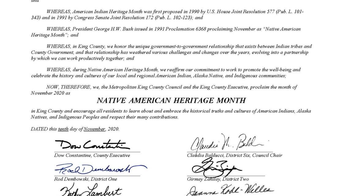 As part of our celebrations for Native American Heritage Month, the Metropolitan King County Council and King County Executive Dow Constantine have proclaimed the month of November 2020 Native American Heritage Month in King County. Native American Heritage Month was initially proposed in 1990 as American Indian Heritage Month by U.S. House Joint Resolution 577, and in 1991 by Congress Senate Joint Resolution 172, before November was ultimately proclaimed as “Native American Heritage Month” by President George H.W. Bush in 1991. “Whereas, in King County, we honor the unique government-to-government relationship that… Read More