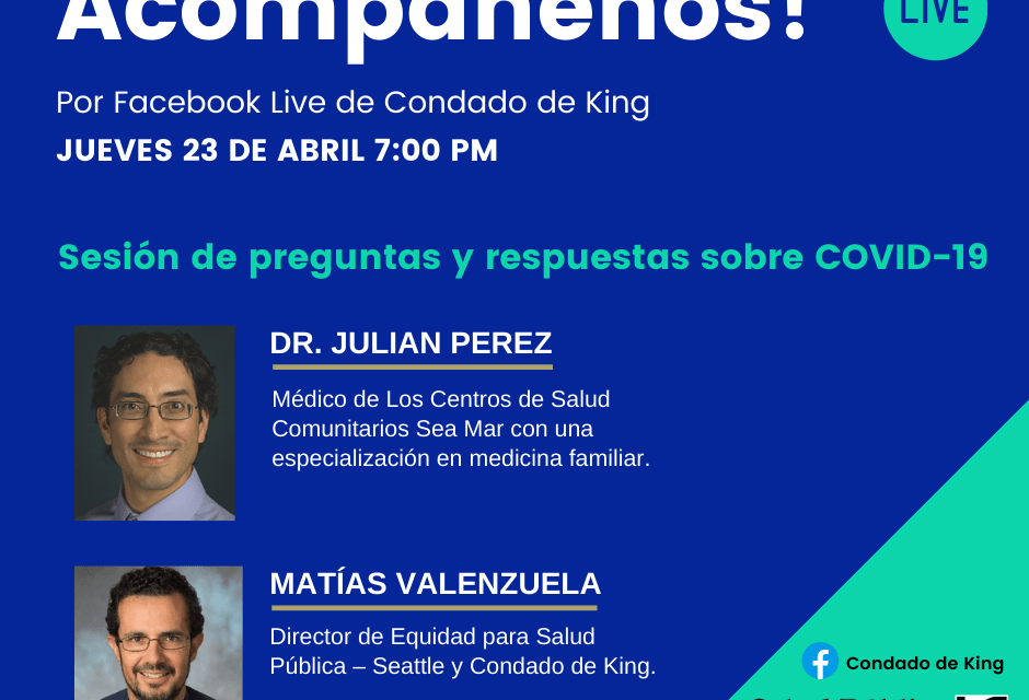 In a virtual seminar, this Thursday, April 23, 2020 at 7 p.m., we will talk about the impacts of coronavirus (also known as COVID-19) on the Latinx community. We will respond to your questions, and more If you have a specific question, we would love to hear it. You can write your questions into the comments on the Facebook event or announcement. Follow us on the Condado de King Facebook page to receive a reminder the day of the virtual seminar. This event will feature Matias Valenzuela, Director of Equity for Public Health – Seattle & King County, and… Read More