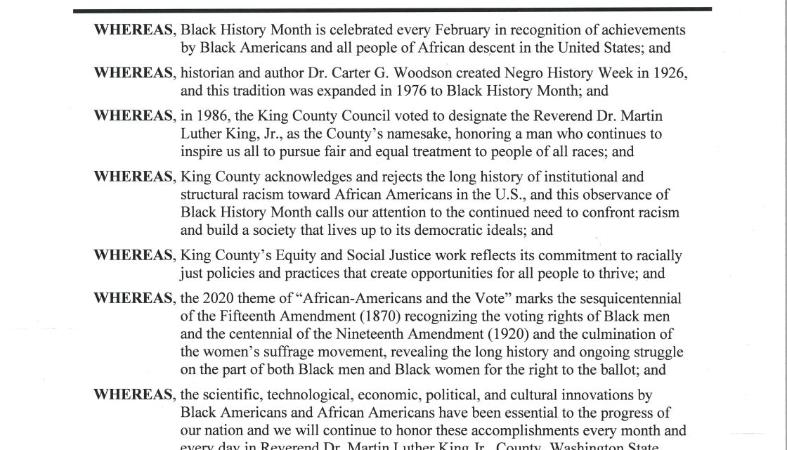 King County Executive Dow Constantine has proclaimed February 2020 to be Black History Month in King County. “Whereas. the scientific, technological, economic, political, and cultural innovations by Black Americans and African Americans have been essential to the progress of our nation and we will continue to honor these accomplishments every month and every day in Reverend Dr. Martin Luther King Jr., County, Washington State,” Executive Constantine said in his Proclamation.