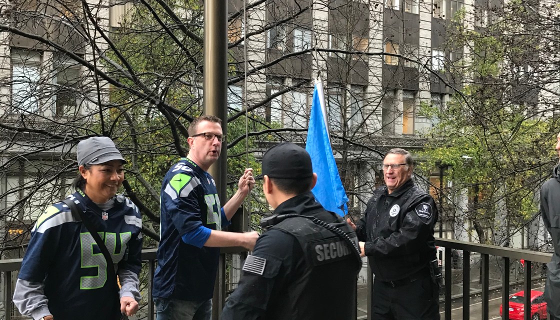 Employees come together to raise Seahawks flag