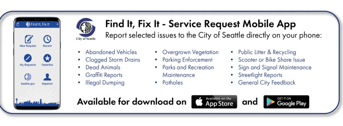 It’s easy for residents and people working in Seattle, including King County employees, to report non-urgent public issues. The City of Seattle’s Find It, Fix It mobile app is a simple way to report an issue, track reports, and view service requests. Examples of issues include a streetlight outage, clogged storm drain, graffiti, abandoned vehicles, illegal dumping, unauthorized encampment, and potholes. If you see an issue that needs addressing near or on the way to a County workplace in Seattle, use the app to report it. The app is not for reporting urgent… Read More