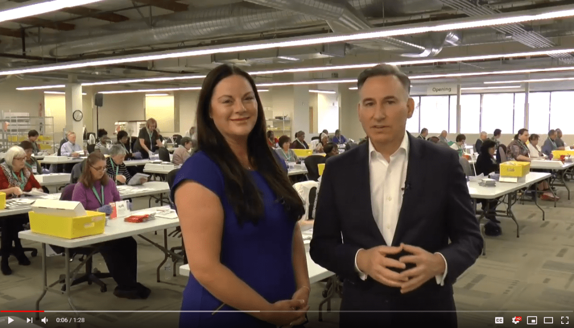 King County Executive Dow Constantine visited King County Elections headquarters in Renton on Election Day as the staff counted ballots. This is the first General Election since he and Director Julie Wise made it possible for King County voters to return ballots without having to pay for postage.