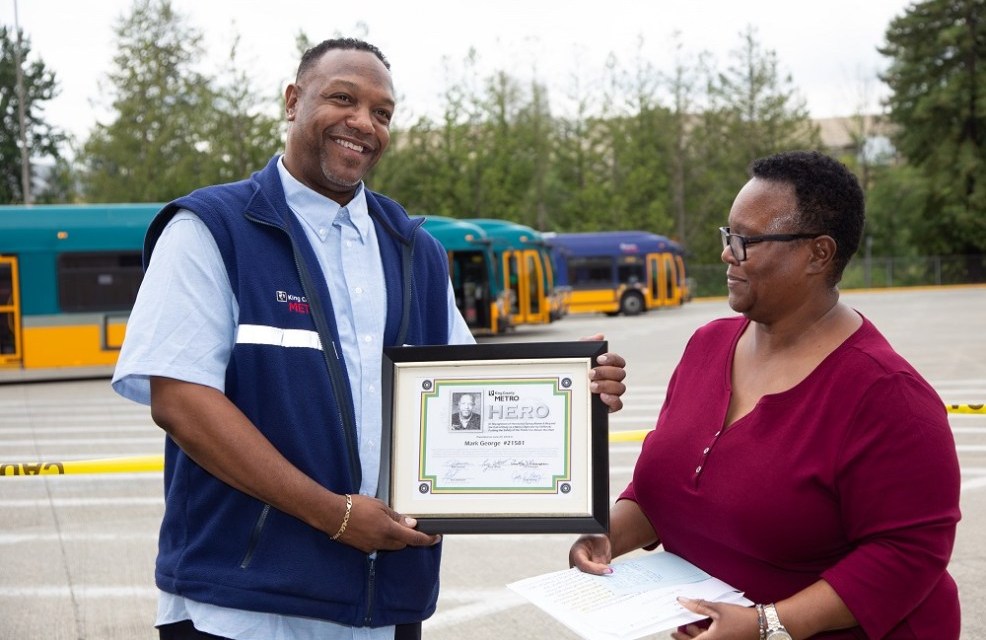 Crossposted from Metro Matters By Scott Gutierrez, King County DOT King County Metro bus driver Mark George didn’t hesitate when two people in a burning car needed his help. On the evening of May 12, George was driving his usual route near the Eastgate Park-and-Ride when an oncoming vehicle lost control while turning and collided with the side of his bus. The car ricocheted into a boulder wall and caught fire. George quickly checked on his passengers and rushed to the other vehicle with a fire extinguisher. He doused smoke rising from… Read More