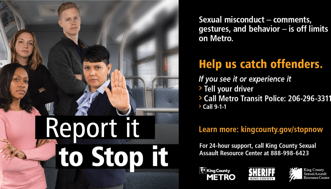 Crossposted from Metro Matters By Rob Gannon, King County Metro General Manager Today Metro launched an important public awareness campaign to encourage reporting of unwanted sexual harassment and misconduct on board our services. We’re working with the King County Sheriff’s Office, Metro Transit Police, King County Sexual Assault Resource Center, and local law enforcement to increase awareness, encourage reporting, support victims, and reduce misconduct through our “Report it to Stop it” effort as part of National Sexual Assault Awareness Month. All of us have a critical role to play in keeping one another… Read More