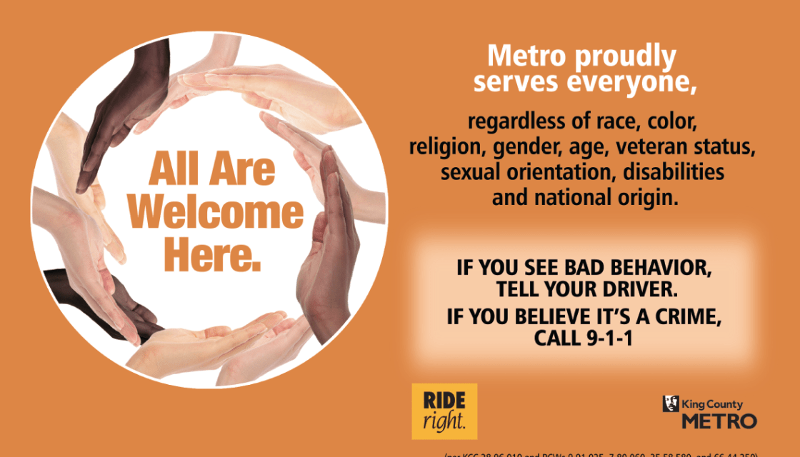 Crossposted from Metro Matters As King County Metro grows and changes in our role as the regional mobility provider, there’s something we’ll never leave behind: our commitment to keeping Metro safe and welcoming for everyone who uses our services or works here. The recent terrible events in Texas, New York City and elsewhere are grim reminders of how important that commitment is. New signs you’ll see on our buses for the long term reflect our promise to always look out for one another. They assure customers that “all are welcome here,” regardless… Read More