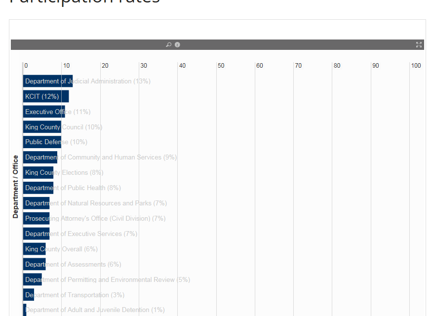 The King County employee survey is now underway through Friday, October 21. Track how well your department is participating by checking out the data on the survey website. Surveys were emailed to most employees from 2016KCEmployeeSurvey@orcsurvey.com on Monday, Sept. 26. The email is unique to each employee and cannot be forwarded to others. If you did not receive a survey email, please contact KCEmployeeSurvey@kingcounty.gov. Please note your responses are completely anonymous to King County and the consultant only shares analyzed results, never individual responses. The survey should take about 15 minutes to complete and can be taken during… Read More