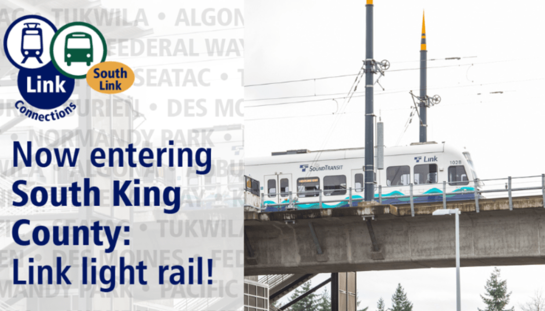 Crossposted from Metro Matters As Link light rail extends south, King County Metro’s South Link Connections mobility project is working to improve public transportation for communities in south King County. We invite you to learn more about these proposed changes and take our survey by February 28. In response to what we heard from community members in Algona, Auburn, Burien, Des Moines, Federal Way, Kent, Normandy Park, Pacific, SeaTac, Tukwila, and parts of unincorporated King County, Metro is proposing several improvements to service and is seeking your input. Read more.