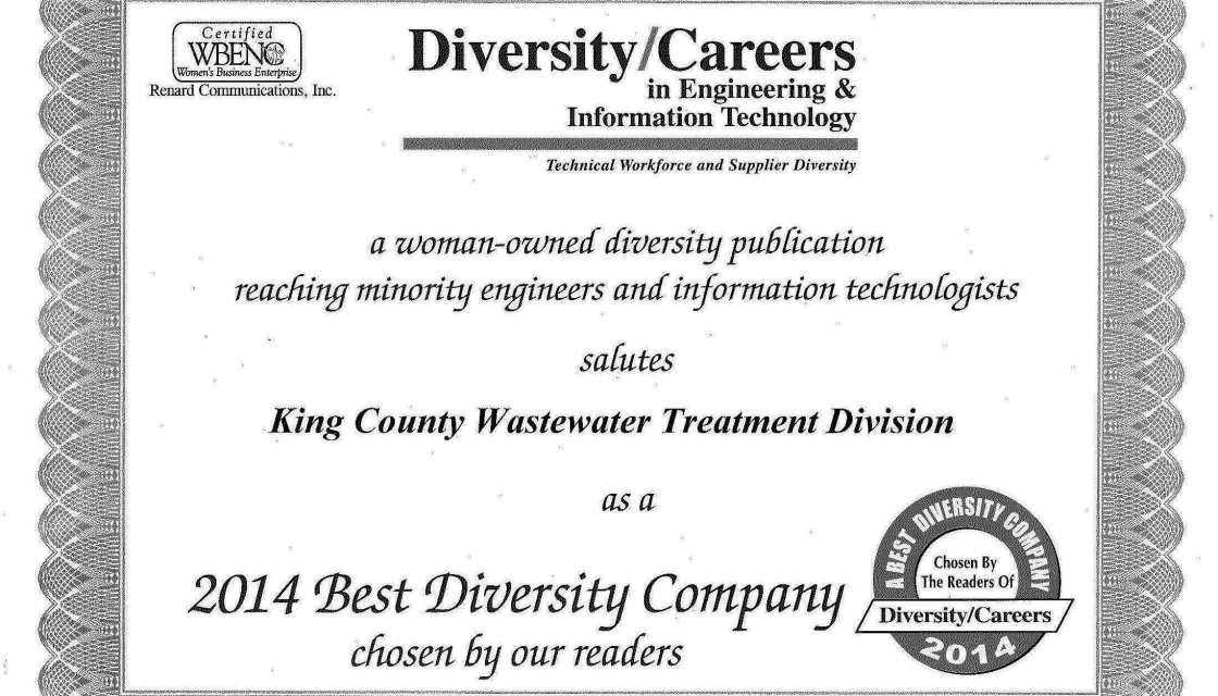 King County’s Wastewater Treatment Division was recognized as a 2014 diversity leader in engineering and information technology by the magazine Diversity/Careers, joining organizations like IBM, the U.S. Navy and Microsoft. The woman-owned publication is targeted to women and minority groups interested in careers in engineering and information technology. The magazine asked its online readers to look at a list of companies and organizations to identify which ones exemplified workforce and supplier diversity. Participants had an option to add or delete organizations from the list. WTD was one of the five organizations selected under the Engineering, Construction & Infrastructure category. The other organizations under the category were Baker Hughes, CH2M Hill, HNTB, Turner… Read More