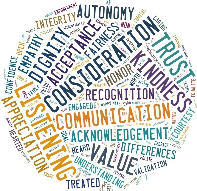 We recently asked King County employees to tell us what respect in the workplace means to them in one word. The way we treat one another is just as important as the way we treat our customers, and helps define the type of workplace that we want. Some of the words that resonated the most with employees were Consideration, Kindness, Communication, Trust, Listening, Value, Acknowledgement, Dignity, Acceptance and Appreciation. You can see all the results displayed in a Word Cloud below.