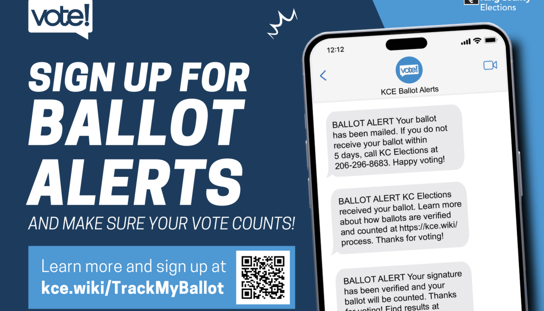 Visit kce.wiki/BallotAlert to receive an alert when we’ve received your ballot back at King County Elections Headquarters, and when your signature has been verified. We will send you a reminder to vote before Election Day, and an alert if there’s any issue with your signature. Ballot alerts are the best way to track your ballot through every part of the process. For more information, visit https://kingcounty.gov/en/home/dept/elections.