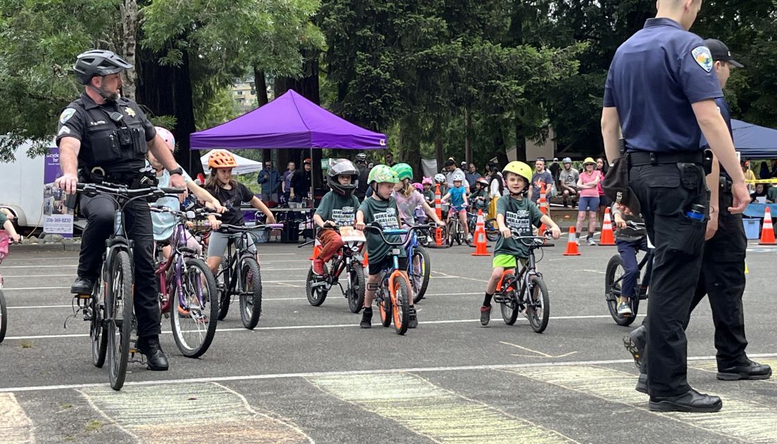 On the beautiful morning of Saturday, June 22, the Maple Valley Police Bicycle Rodeo at Lake Wilderness Park provided an excellent opportunity for new bicycle riders to hone their skills. Children ages 10 and under were able to practice essential cycling skills, such as navigating around distracted pedestrians in crosswalks and maneuvering around “boulders,” painted foam pieces on the road. Sixty-two kids took turns overcoming these obstacles under the guidance of Officer Baldwin and Master Police Officer Olmsted, along with the assistance of the Maple Valley Explorers, a volunteer program for young… Read More