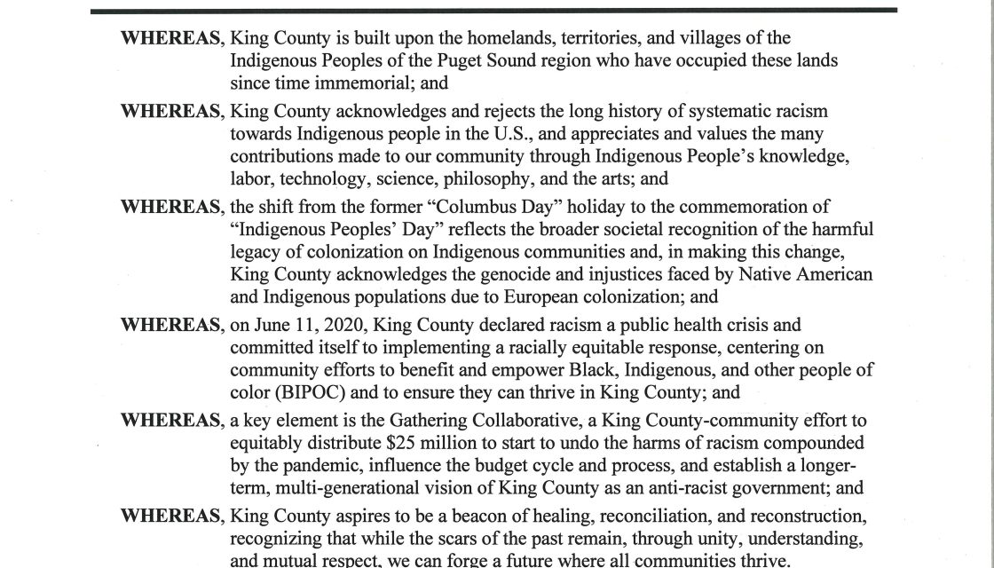 King County Executive Dow Constantine, proclaimed Oct. 9, 2023, as Indigenous Peoples Day in King County and encourages all residents to learn about and embrace the historical truths and cultures of American Indians, Alaska Natives, and Indigenous Peoples, and to respect their many contributions. Read the full proclamation below.