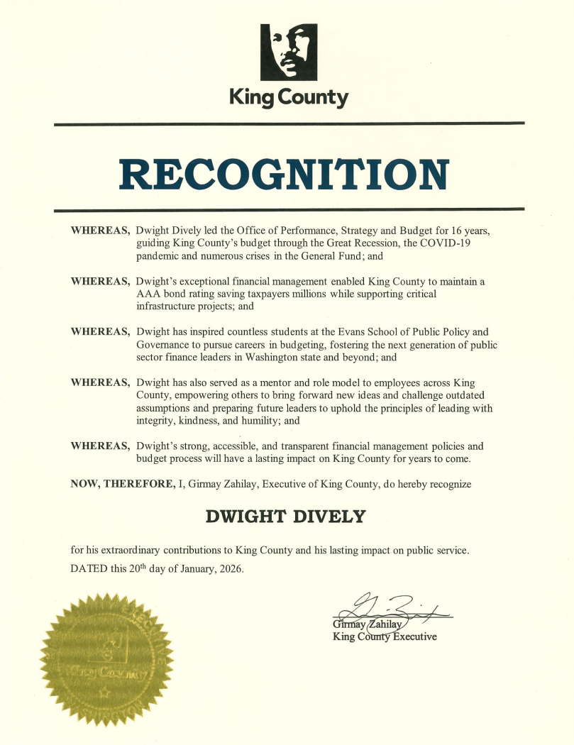 On Thursday, Jan. 22, Executive Zahilay honored Dwight Dively, longtime director of the Office of Performance, Strategy and Budget (PBS) and Chief Operating Officer (COO), with a proclamation thanking him for his service to King County. Dwight served as PSB director from 2010-2025 and COO from 2019-2025. He guided King County’s finances through the Great Recession, the COVID-19 pandemic, and numerous crises in the General Fund. His leadership of King County’s financial management policies and budget process will have a last impact on King County for years to come. Dwight will join the City of Seattle as Finance Director. You can read Executive Zahilay’s proclamation here.
